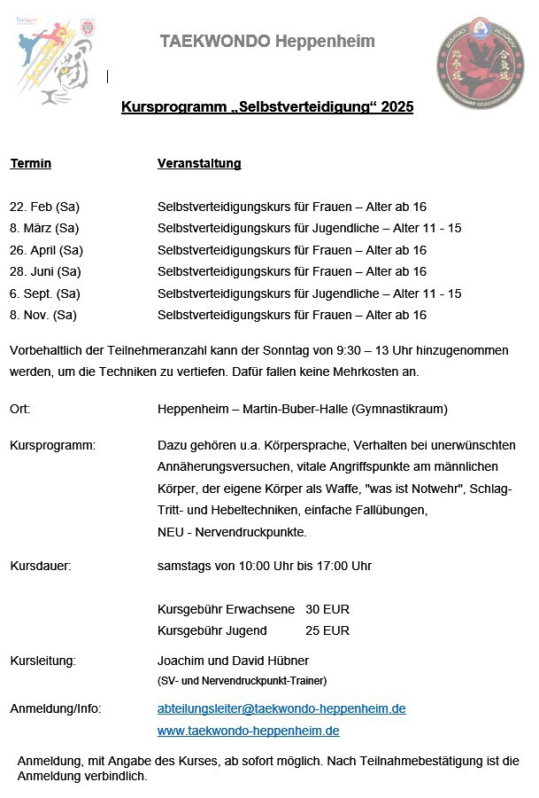 Bei Interesse zu einem der Kurse wende Dich bitte über den eMail-Link abteilungsleiter@taekwondo-heppenheim.de an Joachim Hübner