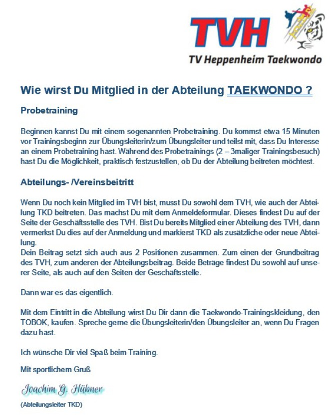 Beitrittserklärung TVH und TKDDieses 3-seitige PDF enthält die Anmeldung zum TVH und zur Abteilung Taekwondo, die Datenschutzerklärung des TVH und die Einverständniserklärung zur Speicherung sportrelevanter Daten in der DTU-Datenbank. Die Einverständniserklärung notwendig für unseren Verband und die Teilnahme an Prüfungen. Daher bitte unbedingt herunterladen, ausfüllen und mit der Anmeldung zusammen bei Trainerin Sandra oder einem anderen Trainer abgeben.
